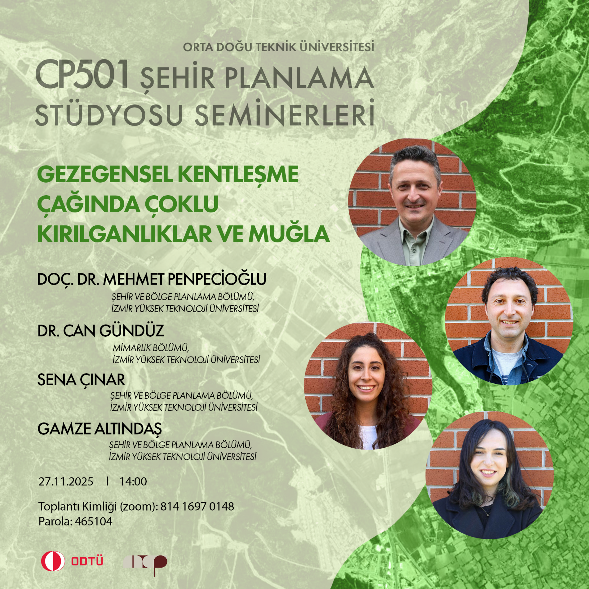 CP501 Şehir Planlama Yüksek Lisans Stüdyosu Seminerleri kapsamında, İzmir Yüksek Teknoloji Enstitüsü Mimarlık Fakültesi üyesi Doç. Dr. Mehmet Penpecioğlu (Şehir ve Bölge Planlama Bölümü), Dr. Can Gündüz (Mimarlık Bölümü), Arş. Gör. Sena Çınar (Şehir ve Bölge Planlama Bölümü) ve Arş. Gör. Gamze Altındaş (Şehir ve Bölge Planlama Bölümü) 27 Kasım 2025 Perşembe günü saat 14.00'da, "Gezegensel Kentleşme Çağında Çoklu Kırılganlıklar ve Muğla" başlıklı sunumlarıyla çalışmalarını bizimle paylaşacaklardır.