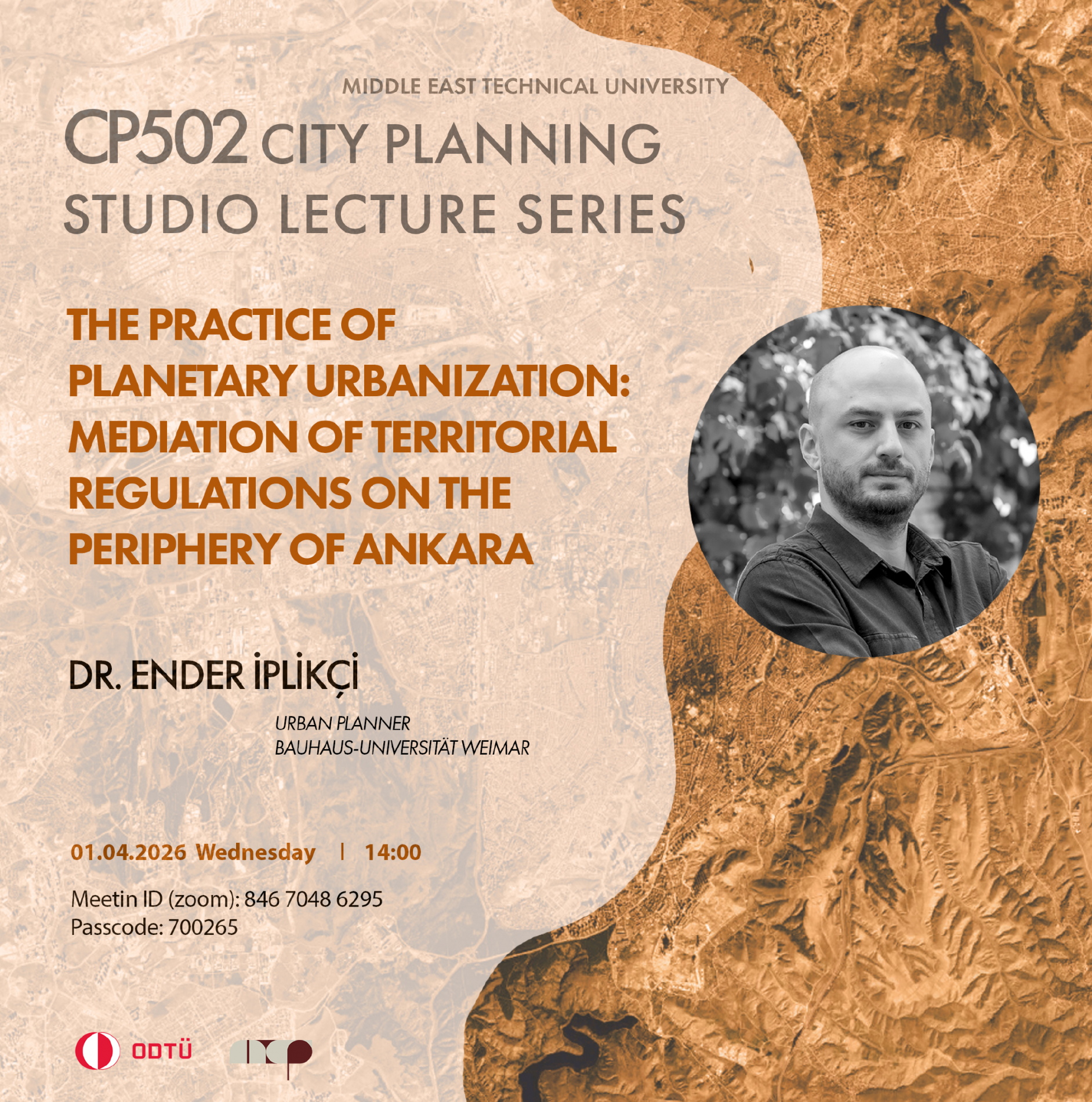 Şehir Planlama Yüksek Lisans Stüdyosu Seminerleri kapsamında, Dr. Ender İplikçi, 1 Nisan 2026 Çarşamba günü "The Practice of Planetary Urbanization: Mediation of Territorial Regulations on the Periphery of Ankara" başlıklı sunumunu gerçekleştirecektir. Seminer çevrim içi olarak düzenlenecektir. Tüm öğrenciler ve ilgililer davetlidir.